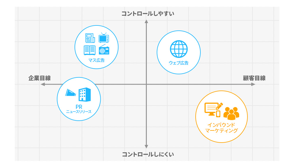 従来のマス広告や通常のWeb広告といったアウトバウンドマーケティングの手法と、インバウンドマーケティングの位置関係を表すと次の図のようになります。