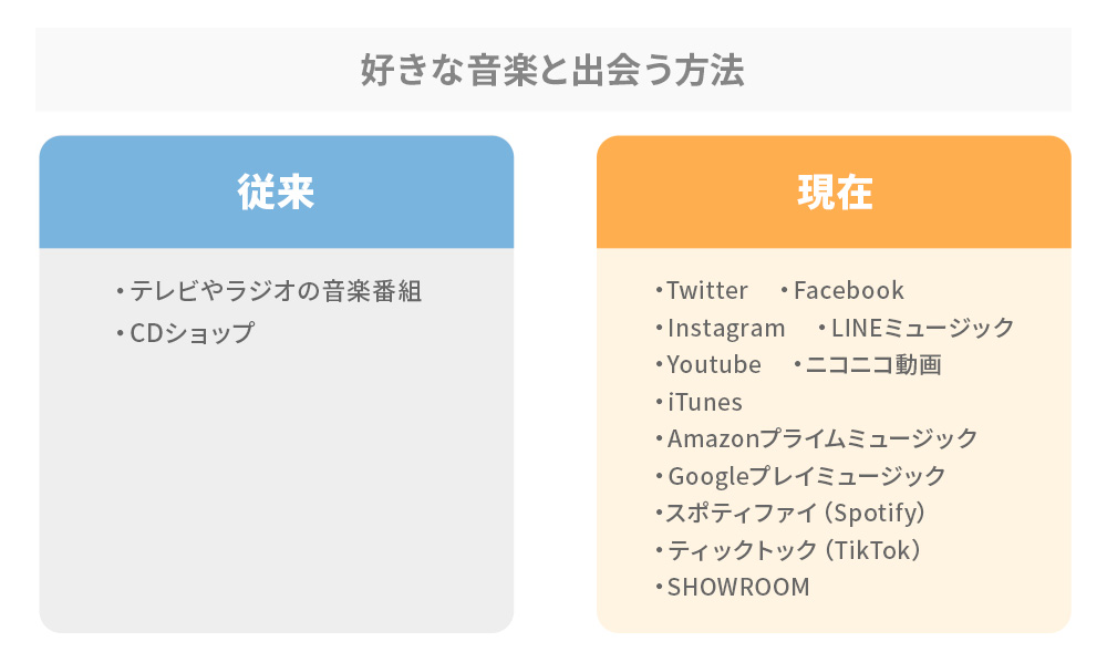 最近では、TwitterなどのSNSやYouTube、ニコニコ動画、iTunes、Amazonのプライムミュージック、Googleプレイミュージック、スポティファイ(Spotify)など、音楽を見つける場所を上げればきりがありません。