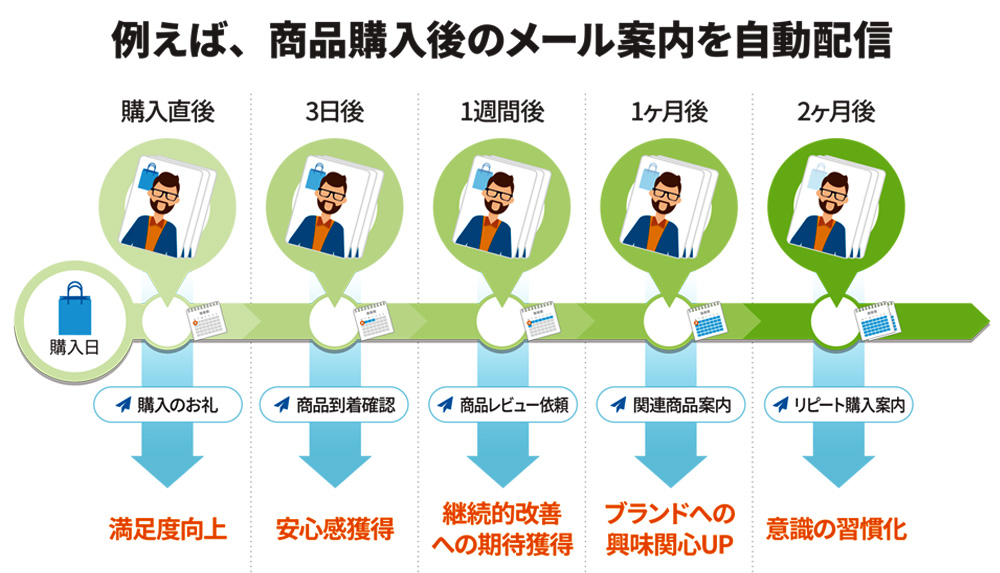 例えば、メルマガ会員全体に同じステップメールを送るのではなく、カートに入れてから3日以上経過したら「お買い忘れではありませんか?」とメールを出したり、以前購入した商品と関連する商品が入荷されたら「こちらもいかがですか」と案内したりします。